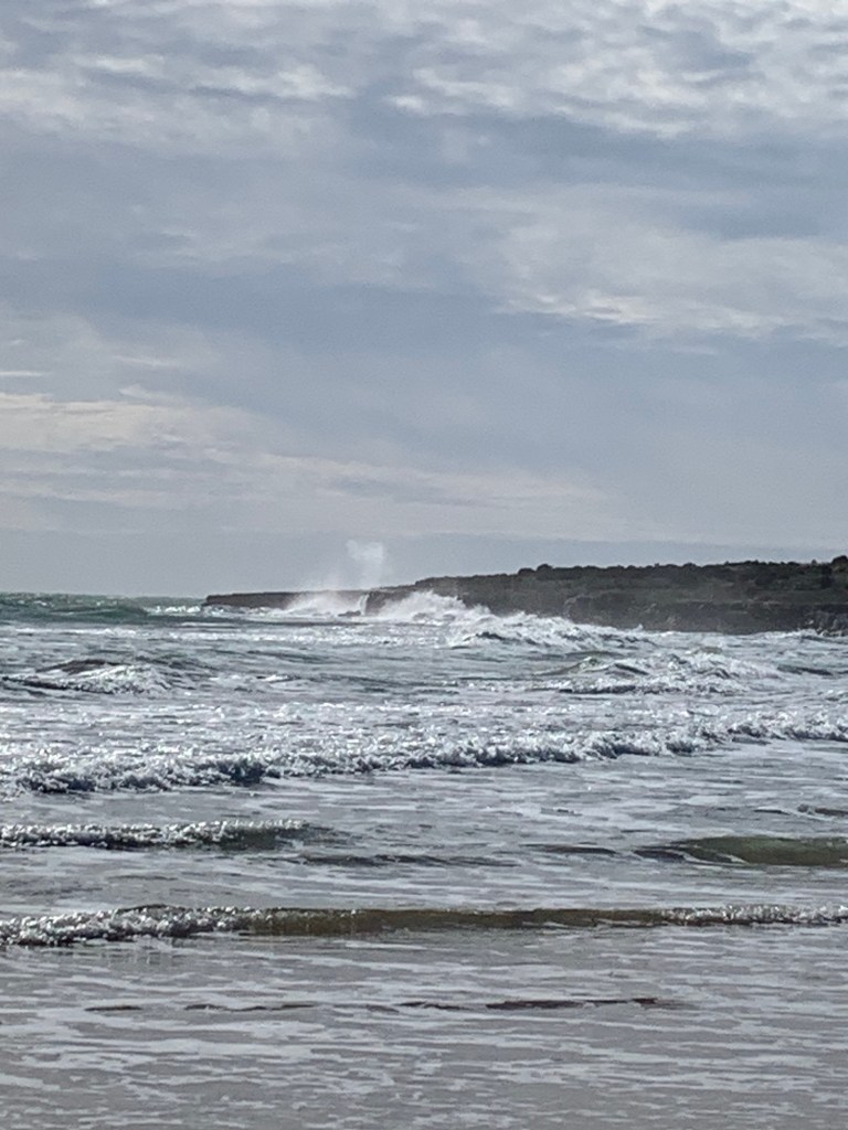 Lounaan jälkeen – minusta maistui oikein hyvälle – oli sopiva hetki lähteä rannalle. Pitkästä aikaa lähdimme ihailemaan meren valtatietä, joka on monta päivää hurissut ja mourunnut kuin Helsingin moottoritiet. Sain kaverin kävelemään paljain jaloin vedessä rollaattorin kanssa. Aallokko oli aika voimakas, ja yhtäkkiä tulikin korkea aaltorintama ja kasteli kaverin jalat ja rollaattorinkin. Siinä piti äkkiä siirtyä etäämmälle , kun vesi oli ulottunut etukorissa olleeseen neulepaitaan ja kännykkään ja vielä sukkiin. Kännykän pikainen irrotus kuorestaan, kuivailu nenäliinalla. Onneksi oli se yksi nenäliina! Istuimme rannan kivillä ja otin kuvia aaltojen leikistä.
