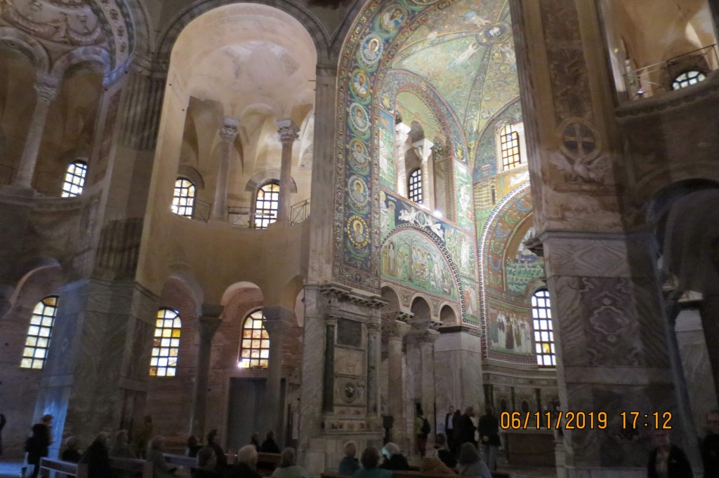 Keskiviikon iltapäivä alkoi mosaiikkikirkkoihin tutustumisella. Kaikki kohteet olivat lähellä, joten oli helppo kulkea isonakin ryhmänä paikasta toiseen. Ensimmäinen ihastelun kohde uskomattoman kauniiden mosaiikkiensa tähden oli San Vitalen kirkko. Sen rakentaminen on aloitettu vuonna 527, ja se on valmistunut 548. Silloin kun kirkko valmistui, Ravenna kuului Bysantin valtakuntaan, piispana toimi Maximilianus, ja kirkon rakentamista rahoittivat keisari Justinianus I:n lisäksi myös kreikkalainen pankkiiri Julianos Argentarios. Runsaat bysanttilaiset mosaiikit ovat hyvin säilyneet, ja sitä pidetään Konstantinopolin ulkopuolella merkittävimpänä kirkkona. Tämä kirkko on yksi niistä kohteista, jotka pitää nähdä omin silmin, sillä niin laimea on kuvaus sanallisesti tai valokuvinkin. Mittaamattoman arvonsa vuoksi tämä kirkko kuuluu Unescon maailmanperintölistalle ja suojeluun kuten Galla Placidian mausoleumi siinä kirkon vieressä. Alabasteri-ikkunoiden läpi auringon valo siilautui kauniisti luoden mielikuvan yli 1000 vuoden takaisesta tunnelmasta. Tämä mausoleumi on rakennettu keisarinna Galla Placidialle (392-450) vuosina 425-430.
