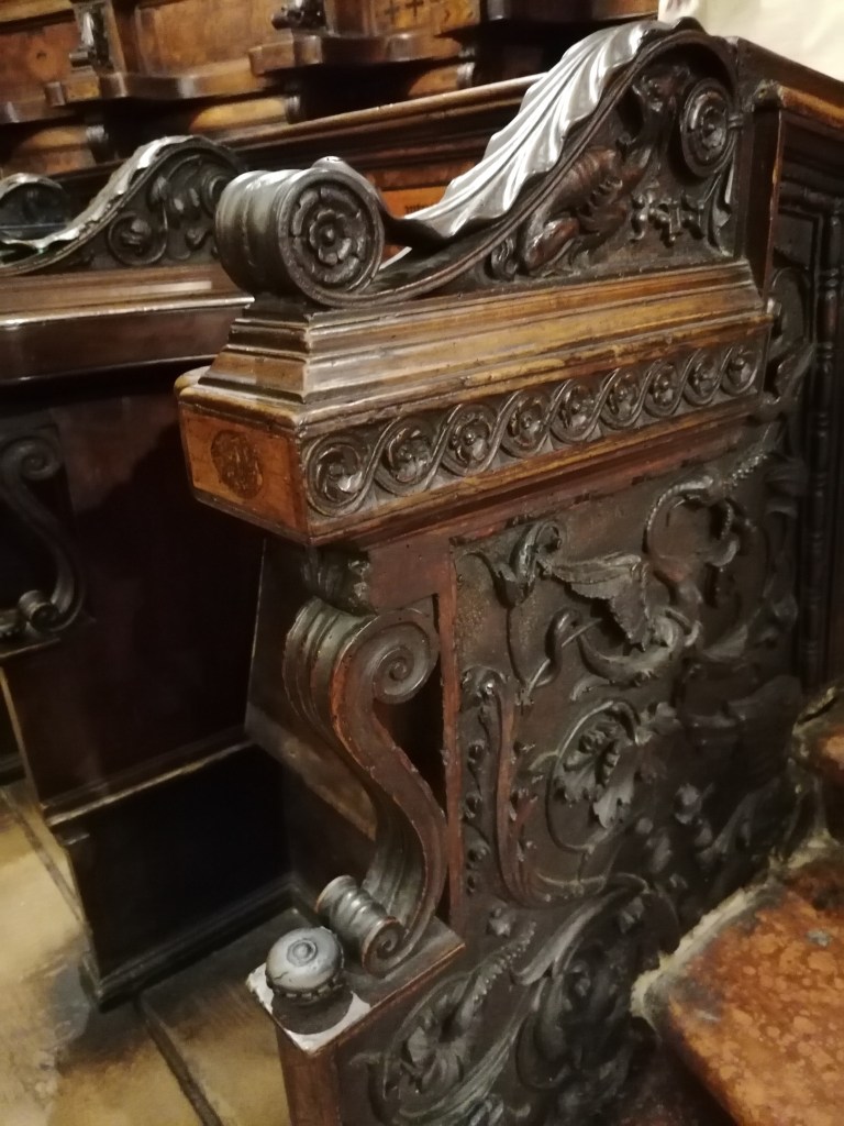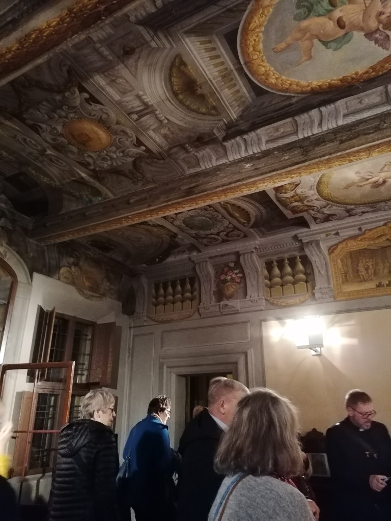 Tämän upean pyhäkön esittelyn jälkeen siirryimme sitten San Domenicon kirkkoon. Pyhä Dominicus ei suinkaan ollut italialainen vaan hän syntyi vuonna 1170 Caleruegassa Espanjassa. Pappisuransa eri vaiheiden jälkeen hän saapui Bolognaan 21.12.1218 johtamaan dominikaanista sääntökuntaa. Bolognasta hän teki saarnamatkoja eri puolille Lombardiaa ja matkusti vielä Roomaan, mutta palasi takaisin. Hän sairastui vakavasti ja kuoli kirkossa 6.8.1221, muistopäivää vietetään 8.8. Pyhiinvaeltajien määrä kasvoi tässä kirkossa, ja parhaat arkkitehdit tulivat rakentamaan arvokkaampaa leposijaa kanonisoidulle Dominucukselle. Myös nuori Michelangelo sai tehtäväkseen veistää puuttuvan enkelin hautamuistomerkkiin. Saimme pitkän ja perusteellisen esittelyn dominikaaniveljeltä kirkosta, pyhäinjäännöshaudasta ja tietenkin myös inkvisition istuntohuoneesta. Upeita teoksia sekä kirkossa että luostarin yhteisissä tiloissa, joissa meitä kuljetettiin.