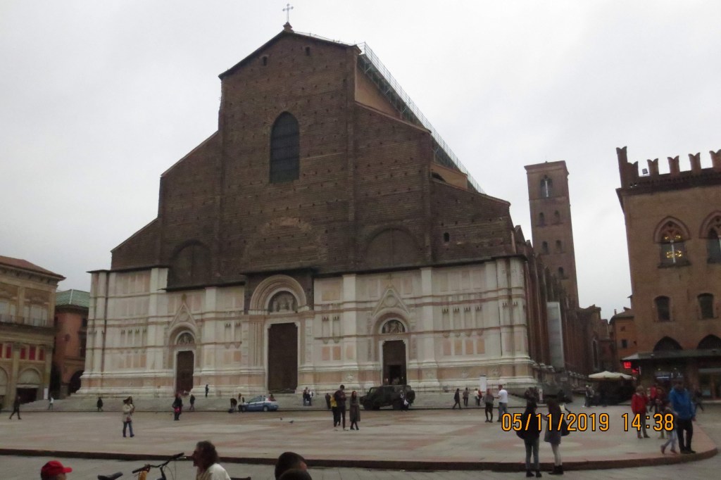 Vapaavalintaisen lounaan jälkeen lähdimme jälleen kävelylle keskellä Bolognaa sijaitsevaan Basilica di San Petronioon. Pyhä Petronius oli Bolognan 8. piispa, toimien virassaan 431-450. Länsi-Rooman keisari Theodosius I:n käskynhaltija murhattiin Bolognassa vuonna 381, jolloin keisari määräsi kaupungin purettavaksi. Kun piispa Petronius tuli ensikäynnille Bolognaan, hänen tuli syvä sääli asukkaita kohtaan raunioituneessa kaupungissa ja niinpä uutena piispana hän päätti rakentaa kaupungin uudelleen. Kaupungin esikuva kerrotaan otetun Jerusalemista. Petronius toimi piispana 19 vuotta kuollen 4.10.450, ja hänen muistopäiväänsä vietettiin tällä päivämäärällä aivan keskiajalle asti, jolloin pyhän Fransiscuksen päivä syrjäytti sen ja uusi muistopäivä on 29.10.