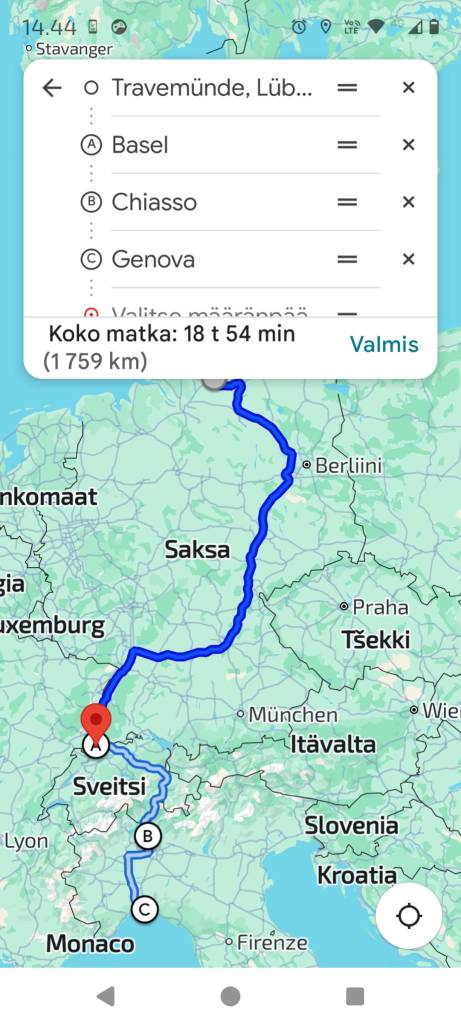 Tämän suunnitelman mukaisesti on siis menomatka jollain tavalla asetettu pöydälle. Paluumatkasta teen vain muutaman merkinnän, joissa olennaisia ovat lähtöpäivä ja sitten lauttapäivä taas kotiinpäin. Joskus teen useamman karkean reittiarvion, joihin teen tarkennuksia lähempänä paluupäivää.