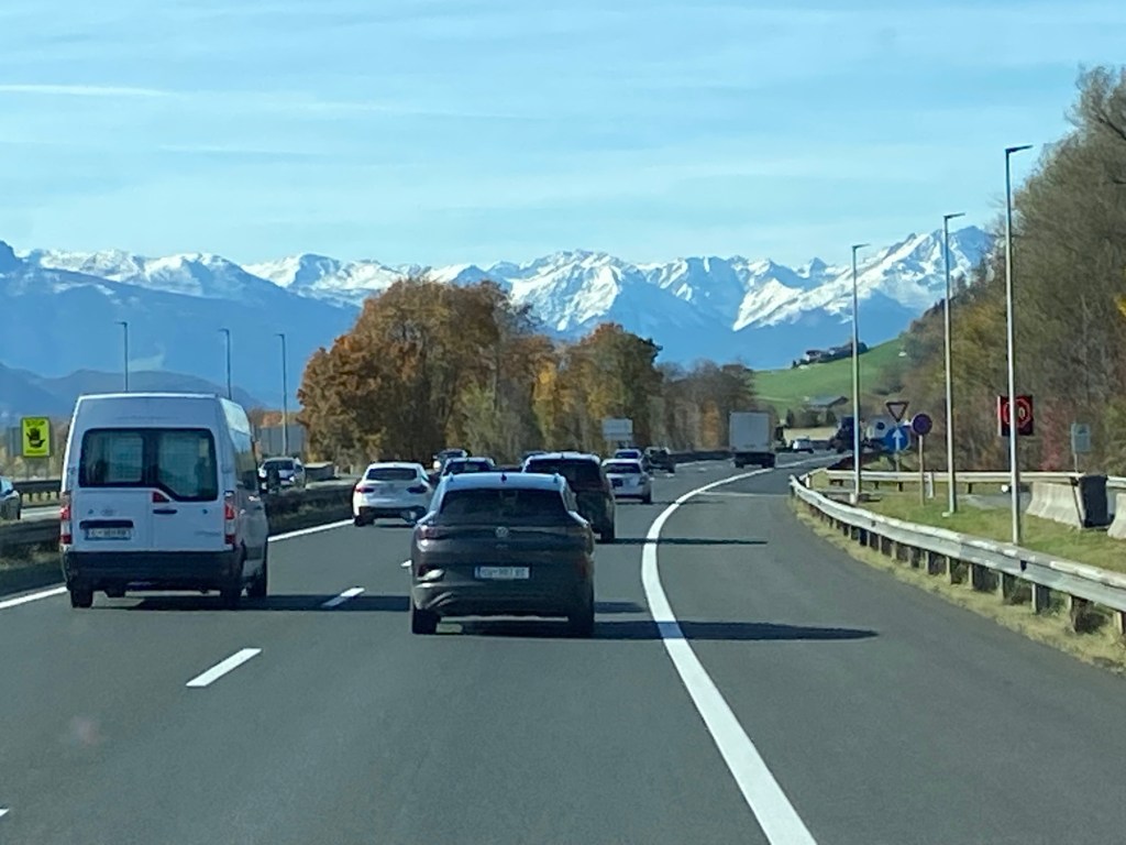 Jos Saksan teillä ajetaan 120-130 km/t, niin Itävallassa nopeus onkin vain 80 km/t. Liikenteen rytmi siis muuttui, kun ajoimme Münchenistä kohti Innsbruckia. Ja nyt myös rekkaliikenne rauhoittui, kun Salzburgin tie erkani meistä. Olin jännittänyt, millaista nyt on ajaa tuota solatietä, jossa on isoja korjauksia ja liikennettä on rajoitettu. Itävallan puolella on 9km pitkä siltatyömaa, ja siellä ajellaan vain yhtä kaistaa, joten ruuhkat ovat mahdollisia. Samoin sitten Italiaan mennessä on rajoituksia ja kavennettuja teitä. Mutta meillä oli todella hyvä ajaa ilman ylimääräisiä pysähdyksiä juuri keskipäivällä tämä haastava tietyöpätkä. Olin ennakoinut, että kun kuorma-autoilijat pitävät keskipäivän lounaansa, on meikäläisellä hyvä hetki ajella. Ja näin todella oli! Taukopaikoilla oli paljon autoja, mutta tiellä ei. Myöhemmin vastaantulevien liikennemäärät alkoivat kasvaa, ja huokasin helpotuksesta. Olin tehnyt oikean valinnan!