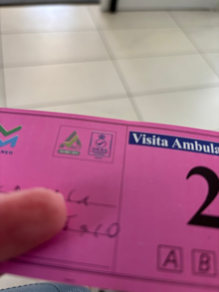Minut ohjattiin pääsisäänkäynniltä alas poliklinikalle, jossa oli ilmoittauduttava uudelleen. Aulassa ei kovin montaa ihmistä istunut, kello oli jo yli 18. Käteen sain kartonkilapun, jossa oli numero ja kirjaimia. Pyydettiin istumaan, minut kutsuttaisiin sitten ajallaan. Ilmoitettu aika meni ohi puolituntia, kunnes minulle sanottiin, että käytävän päässä ovi on auki ja dottore Garofalo odottaa. Olin varautunut selittämään tilanteen, koska kysyimme jo aikaa varatessa, puhuuko tohtori englantia. Ei kuulemma. No en minäkään sitten puhu.