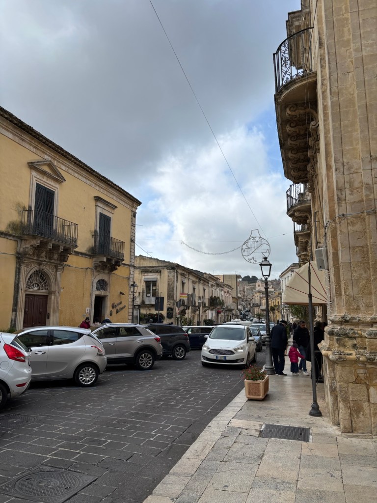Reilu kaksi tuntia ajettiin, valittiin ja arvottiin tienristeyksissä, kunnes oltiinkin perillä vanhassa Akrain kaupungin paikalle rakennetussa Palazzolo Acreidessä. Ja niin kuin aina: yksisuuntaisia kapeita katuja joka puolella, jyrkkiä nousuja, kadunvarret pysäköityjä autoja täynnä! Ja sitten ohje: ”Nyt etsi tästä parkkipaikka! Invapaikka!” Takana autojono, edessä autoja parkissa, ei mitään näkyä eteenpäin tyhjästä tilasta. Vasemmalle, suoraan, vasemmalle, oikealle, ylös🙈🙈🙈. Lopulta olimme aukiolla, jonka toisella puolen hallitsi näkymää barokkikirkko. Käännös oikealle, ja siinä se riittävä yksi vapaa parkkipaikka invapysäköijälle. Koira taluttimeen ja ulos tutustumaan maanjäristysten tuhoaman kaupungin sijoille nousseeseen alueeseen.
