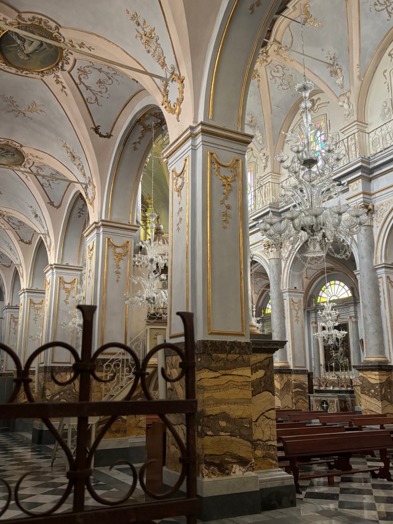 Lähtiessä auton mittari kertoi lämpötilan olevan 18 astetta. Nyt mittarissa oli niukasti 12 astetta. Olimme nousseet korkealle, n 680m merenpinnasta. Ja tuuli meni luihin ja ytimiin. Duomo, San Sebastianon kirkko, oli kyllä auki, mutta täysin hämärä, ilman valoja ja matkamuistojen myyjää. Ja se kylmyys huokui kaikista paksuista seinistä. Kaunis kirkko, jossa on paljon katsottavaa. Otin kuvia, mutta ehkä niistä ei saa riittävää käsitystä. Olisi ihan aihetta käydä toistekin!